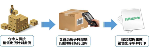 倉庫人員根據(jù)銷售人員的出貨計劃,安排銷售發(fā)貨。倉庫人員使用手持終端設(shè)備掃描源單發(fā)貨通知單,并逐一掃描成品條碼,確認出貨數(shù)據(jù)無誤后,系統(tǒng)生成銷售出庫單。